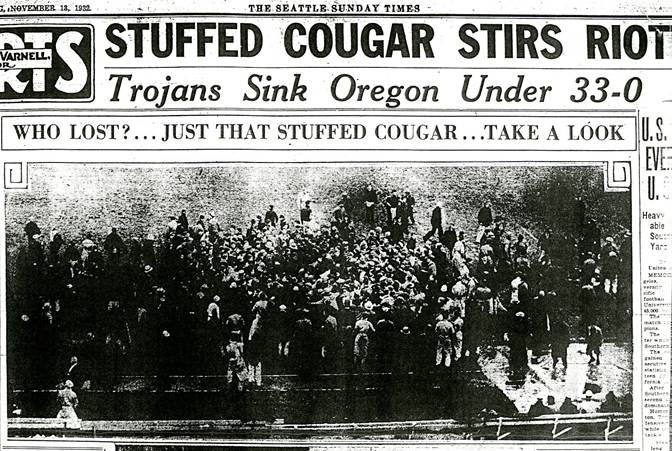 The Apple Cup rivalry goes way back. WSU Libraries University Archivist Mark O’English’s favorite story comes from 1932, the year of the riot over a stuffed cougar mascot University of Washington had stolen 13 years before the fateful game.