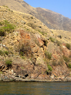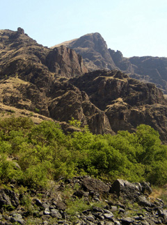 Note the green trees which save the canyon from looking completely dried out even in late August. The colors of the rocks range from shiny black to gray, to browns and shades of rusty red.
