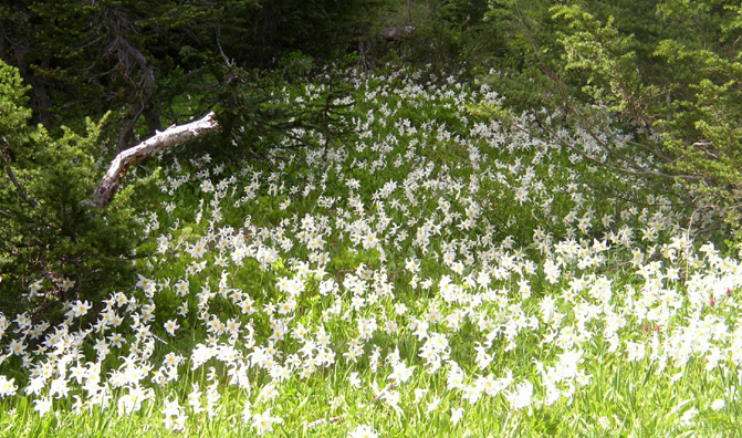 The slopes were covered with thousands of beautiful Avalanche Lilies (Erythronium montanum). To identify the many flowering plants here, pick up a copy of the beautifully illustrated little booklet Mountain Flowers of the Cascades and Olympics, available in the gift shops. The plants are arranged by color, so you'd thumb through the white meadow plants to find these.